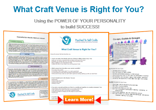If you answer “No” and you find yourself dreading the work you do to promote and sell your handcrafted merchandise, then you are not working to your full potential and not achieving everything you were born to achieve. We want to help you work smarter, grow stronger and live a richer life. After all, today really is the first day of the rest of your life. Let’s work together to make it great!What should you do to get started with Psyched to Sell Crafts? Take our “What Craft Venue is Right for You?” personality quiz. With over 80 pages of content and a bonus printable version to share at craft guild and group meetings or to share with friends! Learn more by clicking the image below: